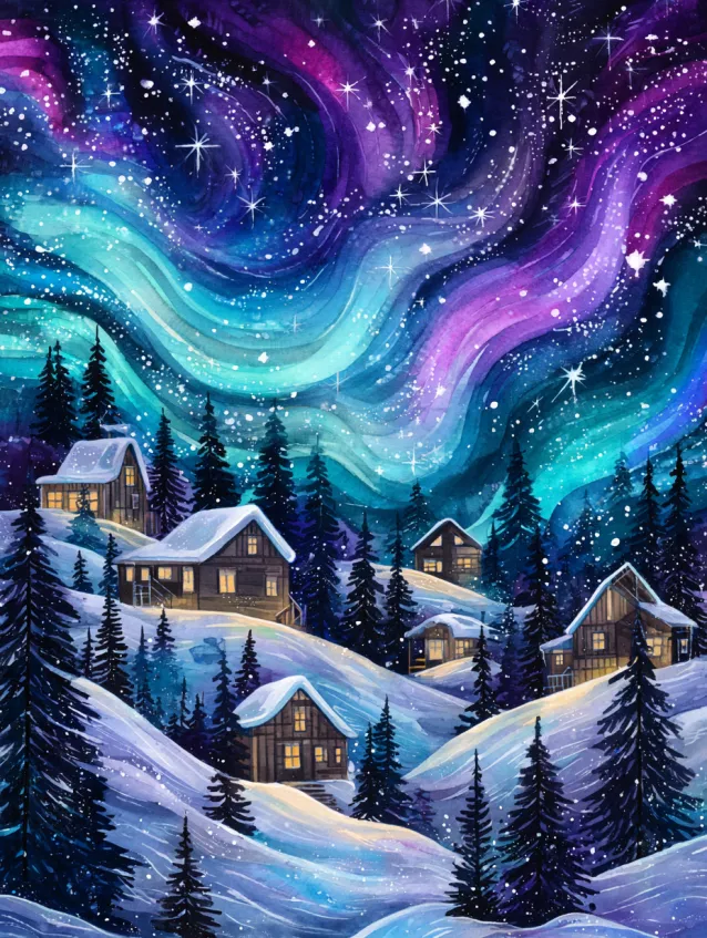 This watercolor painting bursts with sweeping ribbons of teal, violet, and electric blue dancing across a star filled winter sky. Below the glowing aurora, small wooden cabins nestle into rolling snow covered hills, their windows glowing softly against the cool night tones. Dark evergreen trees frame the scene and add contrast, while layered snowy mounds create gentle movement across the foreground. The sky takes center stage with bold, fluid brush strokes that feel alive and luminous.