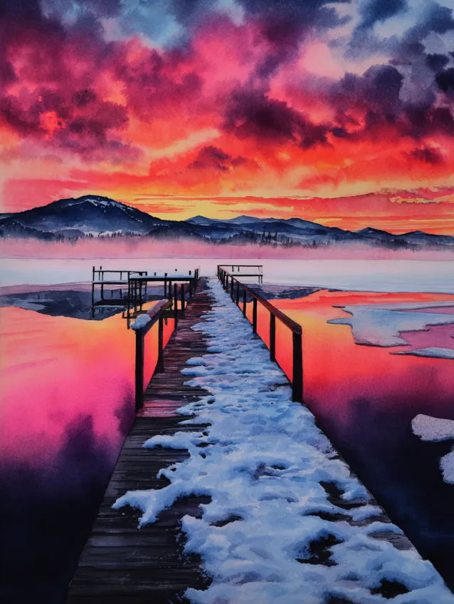 This winter watercolor painting features a wooden pier stretching across a partially frozen lake under a bold crimson and magenta sky. Snow rests gently on the planks, while the water reflects vibrant sunset tones mixed with cool blues. Distant mountains silhouette softly along the horizon, grounding the composition.