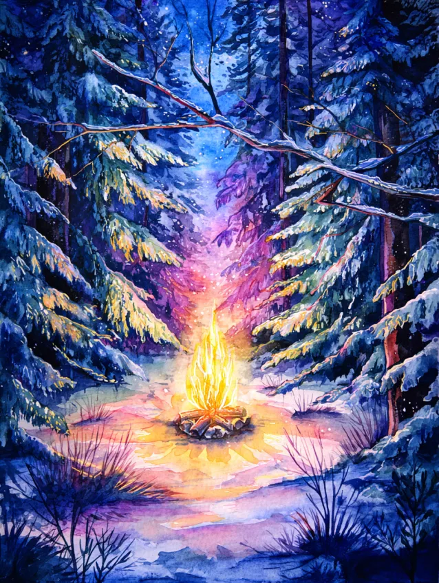 In this winter watercolor design, a glowing bonfire lights up a snowy forest clearing surrounded by tall pine trees heavy with snow. The flames burst upward in warm yellows, oranges, and pinks, reflecting beautifully onto the surrounding snow and tree trunks. Cool midnight blues and purples dominate the forest, creating a stunning contrast with the warm center glow. The composition draws your eye straight to the fire, with layered trees and soft shadows adding depth and intimacy.
