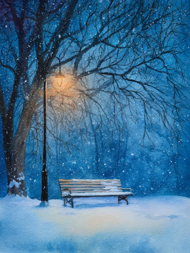 This watercolor scene feels quiet and reflective. A simple wooden bench sits blanketed in fresh snow beneath a softly glowing streetlight. Bare tree branches stretch overhead, painted in deep inky blues that blend into a misty winter night sky. The warm golden light spills gently onto the snow, creating subtle shadows and a peaceful atmosphere. The composition is minimal yet layered, with foreground snowbanks and fading background trees adding dimension.