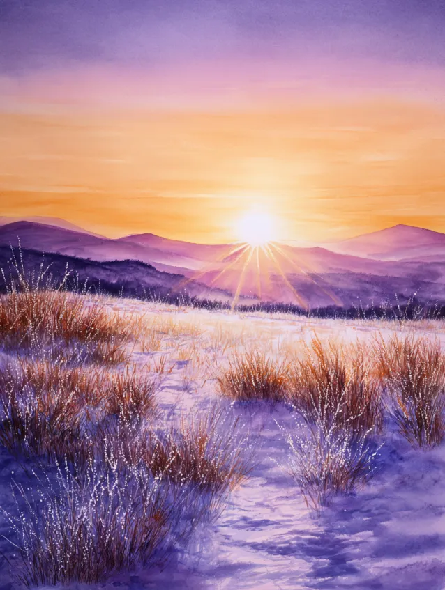 This watercolor painting showcases a wide open snowy meadow glowing under a rising winter sun. Soft lavender shadows stretch across the snow while golden sunlight spills over distant hills. Delicate grasses peek through the frost in the foreground, painted with light upward strokes that add texture and movement. The sky blends from warm peach to soft pink, creating a dreamy early morning atmosphere.