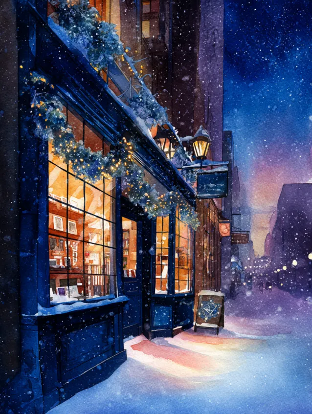 This charming watercolor design features a glowing bookstore storefront tucked into a snowy city street at night. Deep navy blues frame the building exterior while the large window radiates warm amber light from inside. Snowflakes drift gently across the scene, and soft reflections shimmer on the icy sidewalk. The composition feels intimate, with the bright window acting as the focal point against the cool winter night.