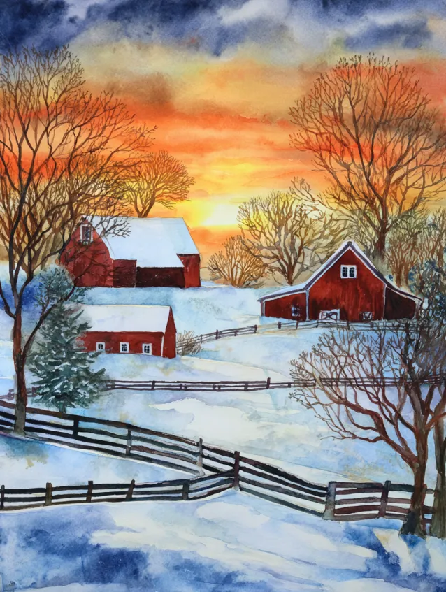 This winter watercolor scene highlights classic red barns resting peacefully under a vibrant orange and pink sunset sky. Snow blankets the rolling fields, while wooden fences lead the eye through the composition. Bare trees frame the barns, their branches etched against the glowing sky. The contrast between fiery sunset hues and crisp white snow makes the entire painting feel bold and dramatic.