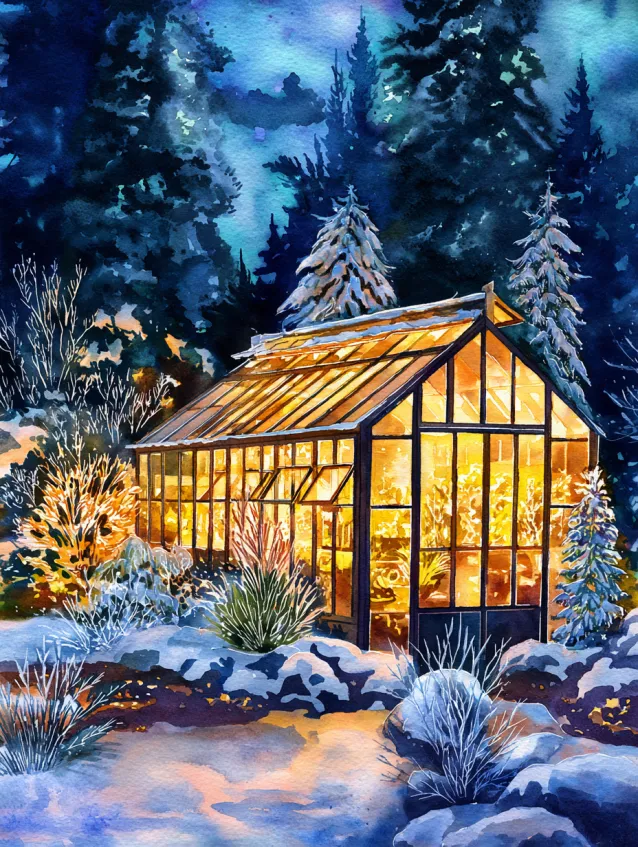This watercolor painting captures a luminous glass greenhouse glowing warmly in the middle of a snow covered garden. Golden light spills through the window panes, illuminating nearby shrubs and frosted plants. Deep blue shadows and snowy textures surround the structure, creating strong contrast and depth. The greenhouse becomes a radiant centerpiece against the cool winter night.