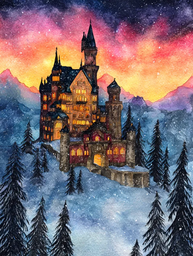 This enchanting watercolor scene features a grand castle perched atop a snowy hill under a dramatic sunset sky. The sky blazes with pink, coral, and deep indigo tones that fade into the horizon. Dark evergreen trees frame the castle, while glowing windows hint at warmth inside. Snow covered slopes guide the eye upward toward the illuminated towers.