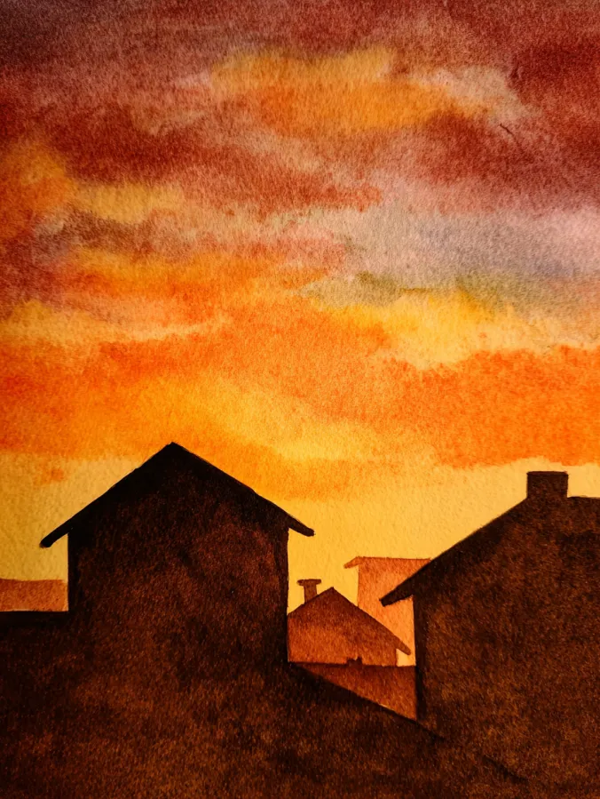 This watercolor painting shows a quiet cluster of rooftops set against a glowing sunset sky. The houses are painted as simple, dark silhouettes with soft, uneven edges that feel organic and relaxed. Behind them, warm layers of orange, gold, and soft rust blend gently into one another, creating a sky full of movement and texture. The brushstrokes are loose and expressive, letting the watercolor bloom naturally on the paper. The overall layout feels balanced and calm, with the buildings grounding the scene while the sky takes center stage.