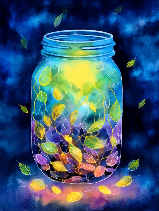 This watercolor painting centers around a glowing glass jar filled with softly layered leaves that seem to shimmer from within. Deep blues and indigo tones surround the jar, creating a rich night like background that makes the warm yellows greens and purples inside really pop. The jar is painted with gentle curved brushstrokes that suggest glass without heavy outlines, while the leaves inside overlap in loose organic shapes. Some leaves drift outside the jar, adding movement and a touch of magic. The overall composition feels balanced and cozy, with the glowing center drawing your eye right in.