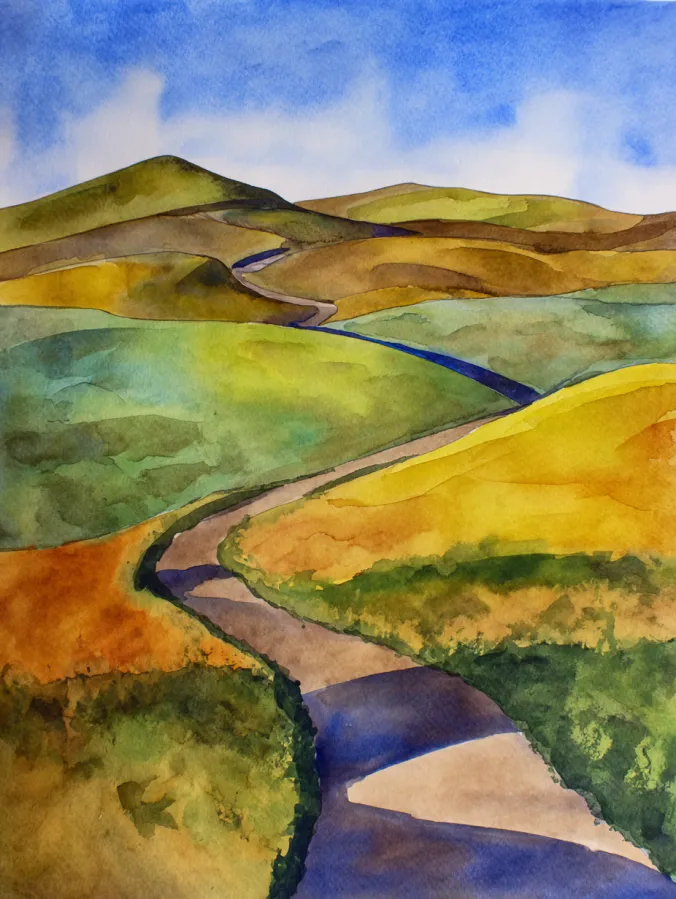 This watercolor painting shows a gentle landscape of rolling hills layered in warm yellows soft greens and earthy browns. A winding path curves through the scene, leading the eye from the foreground into the distance and giving the whole piece a peaceful sense of movement. The brushstrokes are loose and fluid, with colors blending softly where the hills overlap. The sky stays light and simple with pale blue tones, letting the land take center stage. The composition feels open and inviting, like a quiet countryside moment captured with an easy hand.