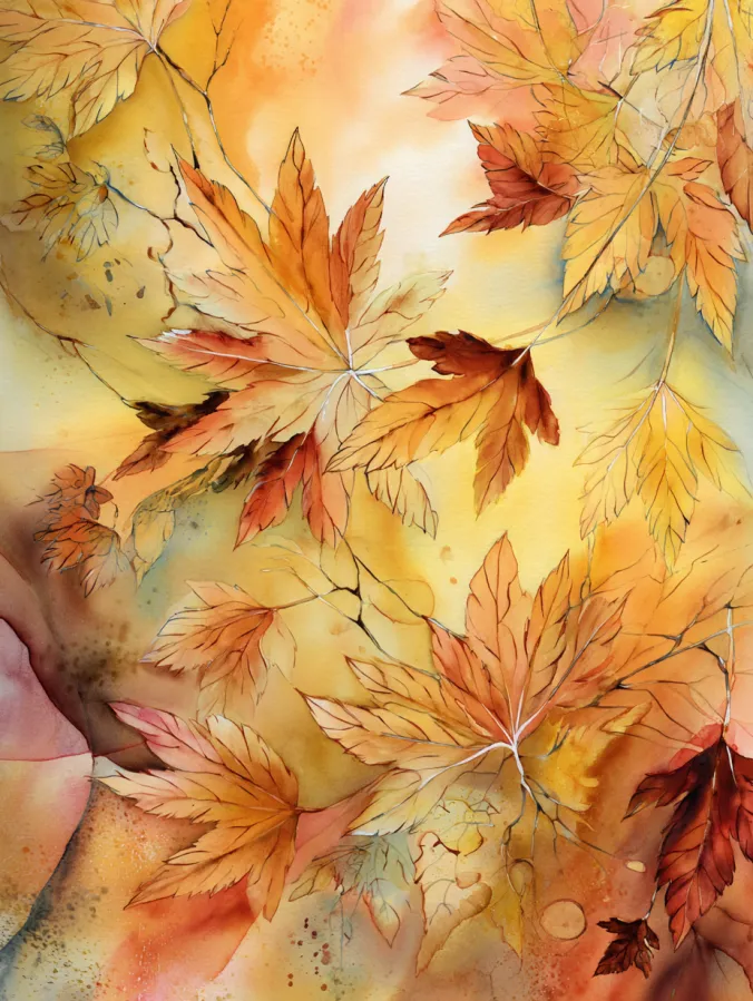 This watercolor painting is filled with softly drifting autumn leaves painted in warm shades of gold amber and burnt orange. The leaves overlap and scatter naturally across the page, with fine line details gently defining their veins and edges. Loose washes blend into a glowing background of soft yellows and muted greens, giving the whole piece a cozy sunlit feel. The brushstrokes are fluid and expressive, letting the colors bleed and bloom in a way that feels organic and relaxed. The composition feels lively but balanced, like a quiet moment during fall when leaves float through the air.