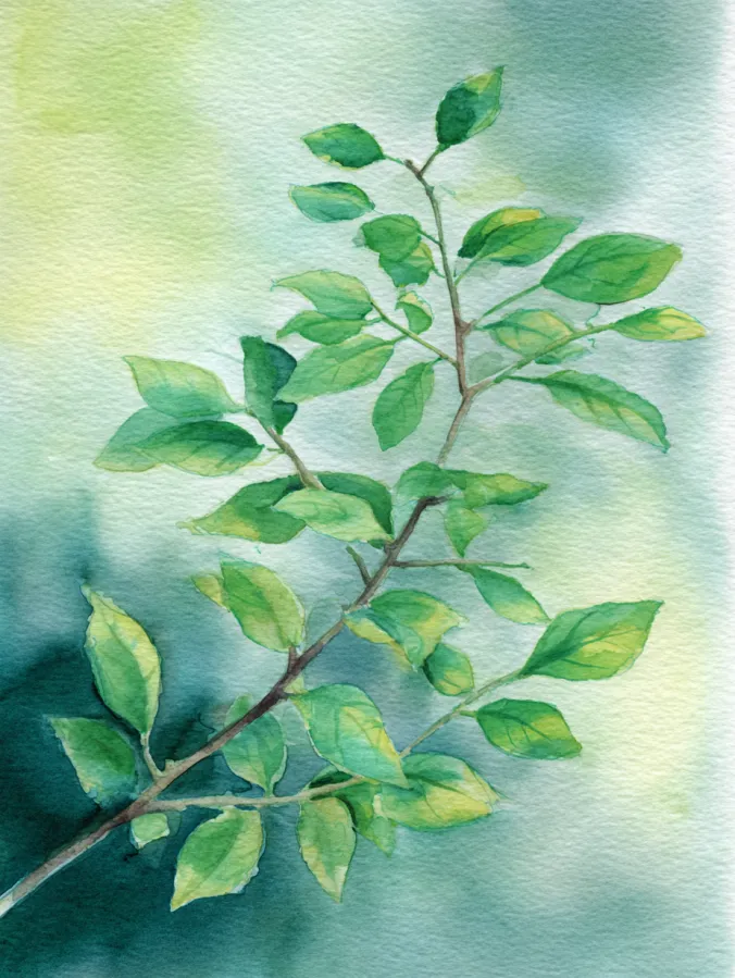 This watercolor painting features a simple leafy branch stretching diagonally across the page, painted in fresh shades of green with soft yellow undertones. Each leaf is formed with loose, layered brushstrokes that let the colors blend naturally, creating subtle variations that feel light and organic. The background is calm and airy, with soft washes of mint and pale teal that gently fade into one another. The composition feels open and uncluttered, allowing the branch to breathe and giving the whole piece a peaceful, natural balance.
