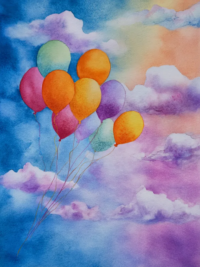 This watercolor painting shows a small cluster of colorful balloons drifting upward through a soft cloud filled sky. The balloons are painted in warm oranges pinks purples and gentle greens, each one slightly different in tone and texture. Loose washes form the sky with blended blues lavender and peach, while fluffy clouds float around the balloons without sharp edges. The strings are thin and delicate, adding a sense of light movement without pulling focus. The overall composition feels airy and joyful, with plenty of breathing room that keeps the scene light and playful.