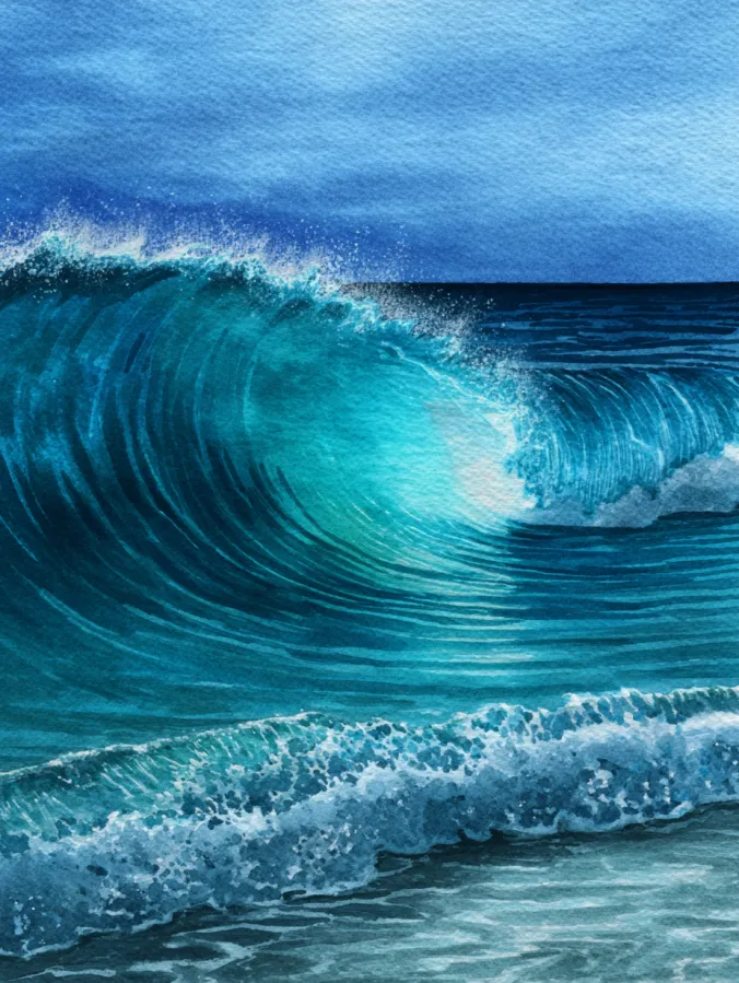 This watercolor painting captures a powerful yet graceful ocean wave curling toward the shore in rich shades of turquoise teal and deep blue. The wave is built with layered brushstrokes that follow the curve of the water, creating a beautiful sense of motion and depth. White foam splashes along the crest and shoreline, painted with loose textured touches that feel fresh and energetic. The horizon stays simple and calm, letting the wave take center stage. The overall composition feels dynamic but balanced, with the water filling the frame in a way that feels immersive and alive.