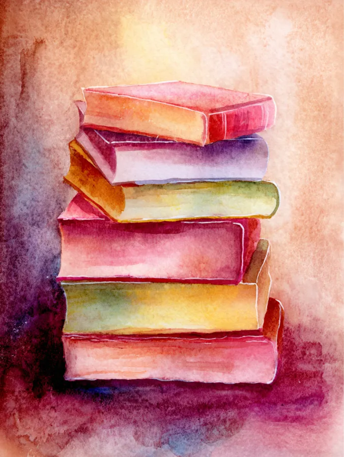 This watercolor painting features a slightly uneven stack of books painted in warm cozy shades of pink coral soft yellow and muted green. The edges are loose and softly defined, with gentle shadows that give the stack a relaxed sense of depth without feeling stiff. The background is a warm blended wash of peach and rose tones that melts smoothly into the page, making the books feel snug and inviting. Brushstrokes stay fluid and expressive, letting the watercolor texture shine through and keeping the whole composition simple and charming.