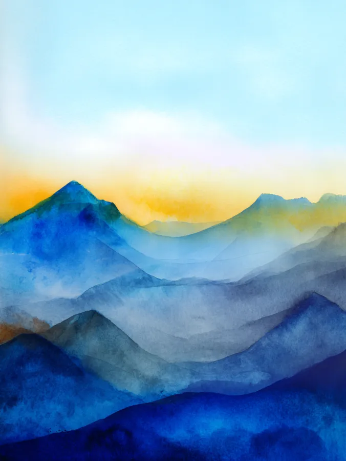 This watercolor painting shows a peaceful mountain landscape built from soft layered shapes that fade gently into the distance. Deep blues and cool indigo tones sit in the foreground, gradually shifting into lighter blue grays and misty hues as the mountains recede. A warm wash of pale yellow near the horizon adds a subtle glow that balances the cool colors beautifully. The brushstrokes are loose and smooth, with soft edges that let the layers blend naturally into one another. The overall layout feels calm and spacious, with a quiet sense of depth that draws the eye upward through the scene.