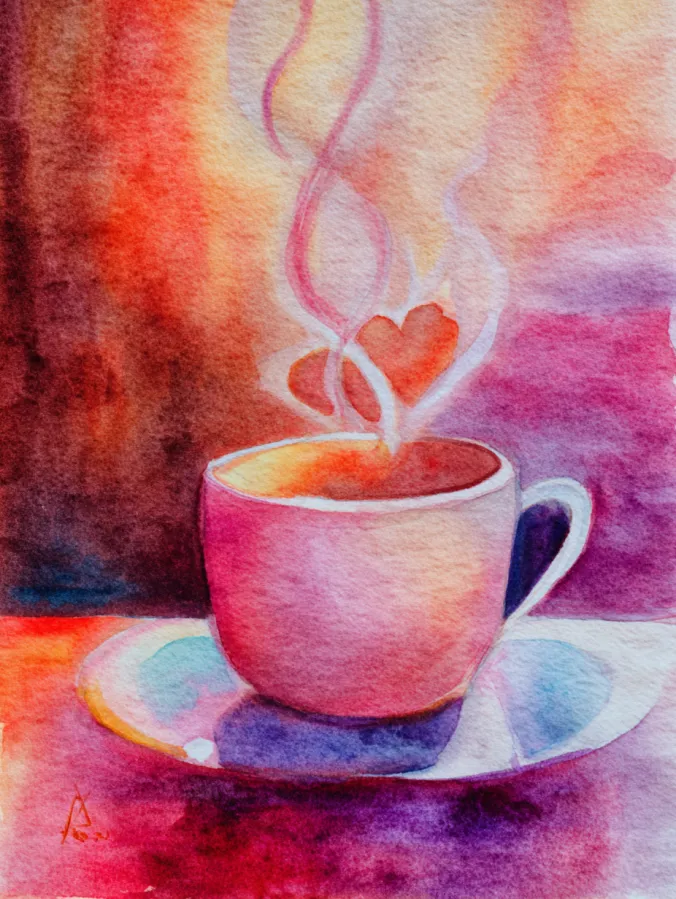 I adore paintings like this because they feel comforting and expressive without needing perfect lines. The cup itself is easy to shape, and the steam gives you permission to loosen up and just have fun. I love experimenting with color blends here and letting the water do its thing. It feels like a quiet creative moment, almost like painting your favorite cozy afternoon, and that makes practice feel more like self care than work.