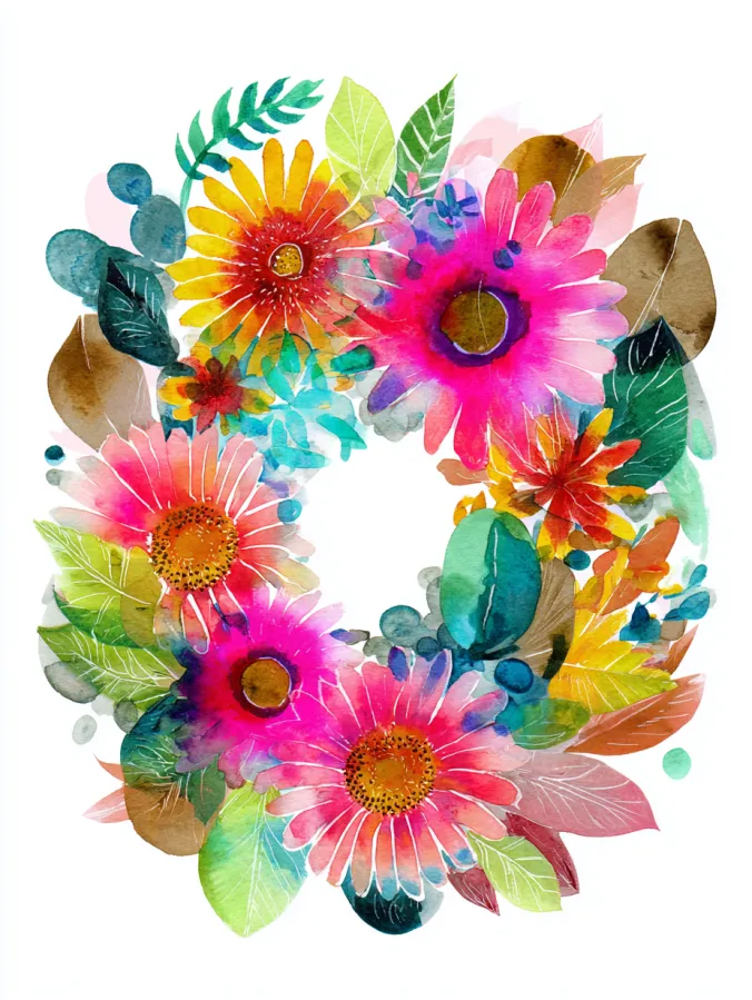 This watercolor painting features a bright floral wreath made up of bold pink yellow and coral flowers surrounded by fresh green and teal leaves. The flowers are painted with loose expressive brushstrokes that let colors blend and bloom naturally, while thin white line details add a soft handcrafted touch. The leaves overlap in playful layers, creating depth without feeling heavy. The circular composition feels balanced and lively, with the open center giving the whole piece a light airy feel that draws the eye around the wreath.