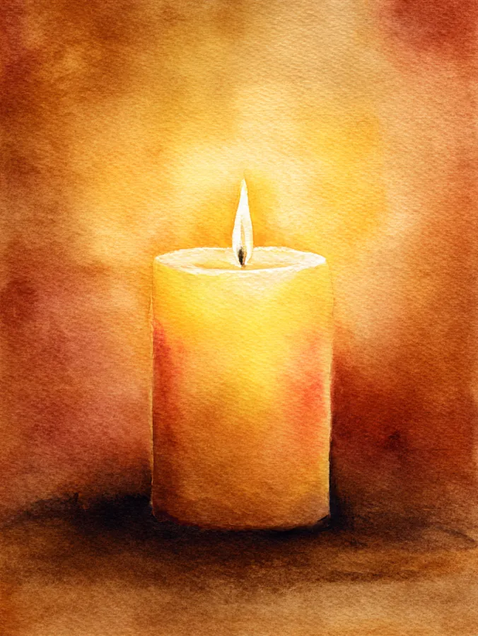 This watercolor painting shows a single candle glowing quietly at the center of the page, surrounded by warm layers of golden yellow, amber, and soft brown. The flame is small but bright, with gentle highlights that fade outward into a cozy haze. Brushstrokes are smooth and loose, letting the colors melt into each other without harsh lines. The background feels softly blurred, which makes the candle stand out while still keeping the whole piece calm and balanced. The texture of the paper shines through, giving the painting a warm, handmade feel that adds to its charm.