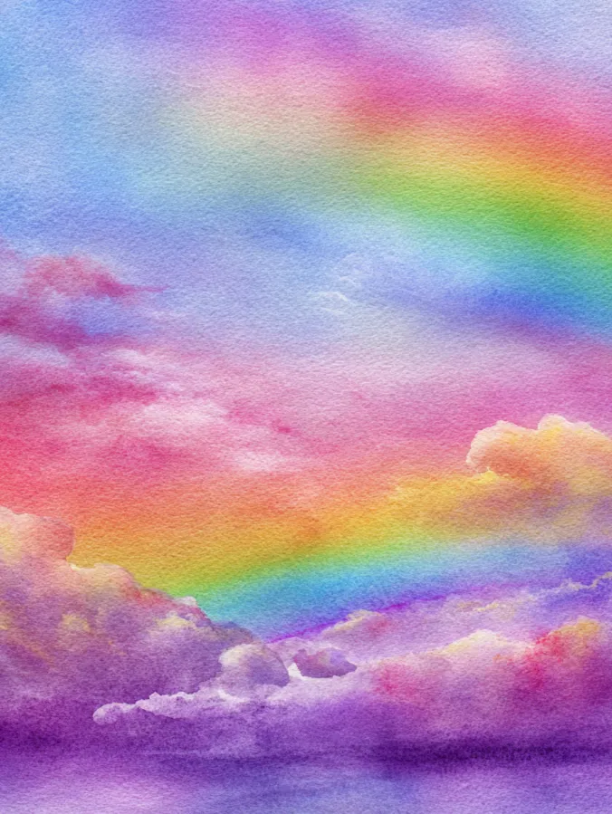 This watercolor painting shows a dreamy sky filled with gentle clouds and a glowing rainbow stretching across the scene. Pastel shades of pink purple blue and warm yellow blend smoothly into one another, creating a soft and airy atmosphere. The brushstrokes are loose and layered, letting the colors melt together in a way that feels light and natural. The clouds are fluffy and softly shaped, sitting comfortably within the sky without sharp edges. The overall layout feels open and calming, with the rainbow acting as a gentle focal point rather than overpowering the scene.