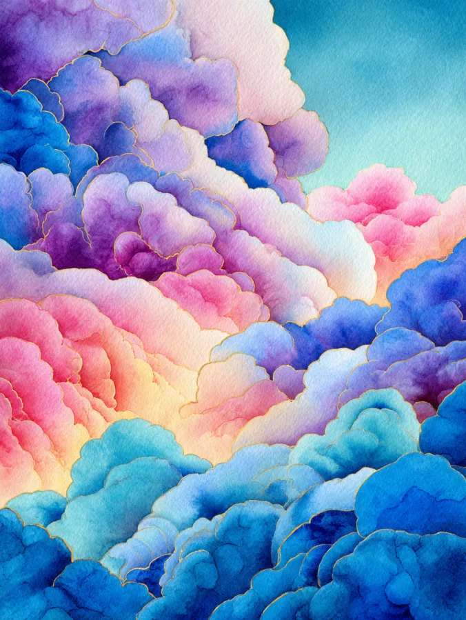 This watercolor painting is filled with soft billowing clouds stacked in dreamy layers across the page. Shades of blue lavender pink and warm peach blend together beautifully, with gentle transitions that feel smooth and airy. Each cloud is formed with rounded brushstrokes that overlap slightly, creating depth without sharp edges. Thin touches of golden linework subtly trace parts of the clouds, adding a hint of sparkle while keeping the overall look calm and cohesive. The composition flows naturally from bottom to top, making the whole scene feel full and comforting.