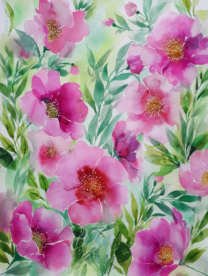 This watercolor painting features a lively pattern of pink flowers scattered across the page, surrounded by soft green leaves and stems. The petals are painted with loose, flowing brushstrokes that let colors bloom naturally from light blush to deeper rose tones. Flower centers are dotted with warm golden hues, adding a gentle focal point without feeling too detailed. The background stays light and airy with subtle washes of green and pale blue, helping everything feel fresh and balanced. The overall layout feels full yet relaxed, like a garden captured in a carefree moment.
