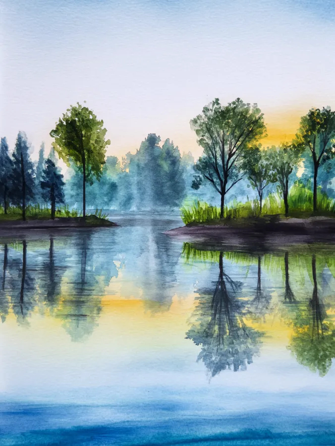 This watercolor painting shows a peaceful lake scene with tall trees lining the water’s edge and their reflections stretching softly below. Cool blues and gentle greens dominate the palette, with hints of warm yellow light glowing near the horizon. The brushstrokes are loose and slightly blurred, especially in the reflections, which gives the water a calm glassy feel. The composition is nicely balanced, with land and sky mirrored almost evenly, creating a soothing sense of symmetry without feeling stiff or overly precise.