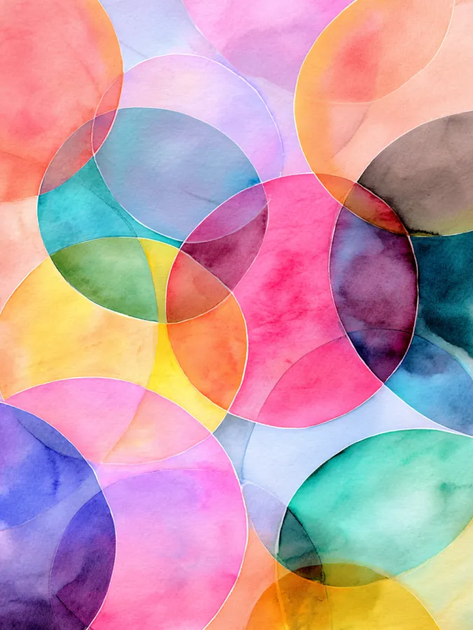 This watercolor painting is filled with overlapping circles in bright cheerful colors that blend beautifully where they meet. Shades of pink teal yellow purple and soft blue layer on top of one another, creating transparent overlaps and unexpected color mixes. The edges of each circle are slightly imperfect, which adds to the relaxed hand painted feel. Brushstrokes are smooth and watery, letting the paper texture show through and keeping the whole composition light and lively. The layout feels balanced but spontaneous, with circles drifting across the page in a fun easy rhythm.