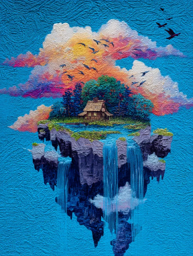 This mini canvas painting shows a magical floating island drifting in a bright blue sky. A tiny wooden cottage sits peacefully among lush green trees at the top of the island. Soft turquoise water gathers around the house before spilling over the rocky edges as several glowing waterfalls. Above it all, fluffy clouds glow with warm shades of peach, coral, and golden orange while small birds circle through the sky. The textured brush strokes give the rocks, trees, and clouds a rich handmade feel, and the vibrant sky creates a bold backdrop that makes the entire little island pop right off the canvas.