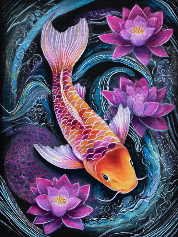This mini canvas painting features a beautiful koi fish gliding through swirling water surrounded by blooming lotus flowers. The koi glows with warm shades of orange, coral, and soft gold while delicate scale details shimmer along its body. Flowing ribbons of deep blue and teal water curve around the fish, creating movement that guides the eye across the canvas. Bright pink lotus flowers bloom around the scene, their layered petals adding softness and contrast against the darker water. Gentle decorative lines and soft highlights give the painting an elegant and slightly dreamy look.