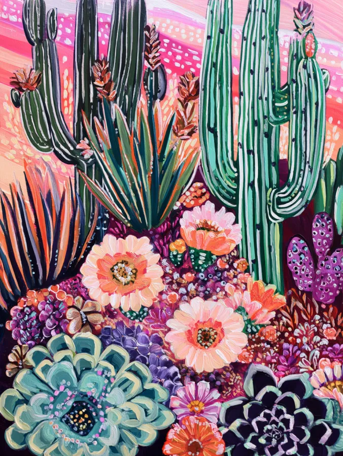 This mini canvas painting shows a lively desert garden packed with playful color. Tall green cacti stretch upward across the scene while spiky succulents and blooming desert flowers fill the foreground. Soft peach, coral, and pink blossoms pop against clusters of purple and teal succulents. The background glows with warm sunset shades of pink and orange, dotted with tiny light patterns that give the sky a cheerful energy. Thick brush strokes create bold outlines and textured petals while the layered plants give the whole composition a full vibrant look.