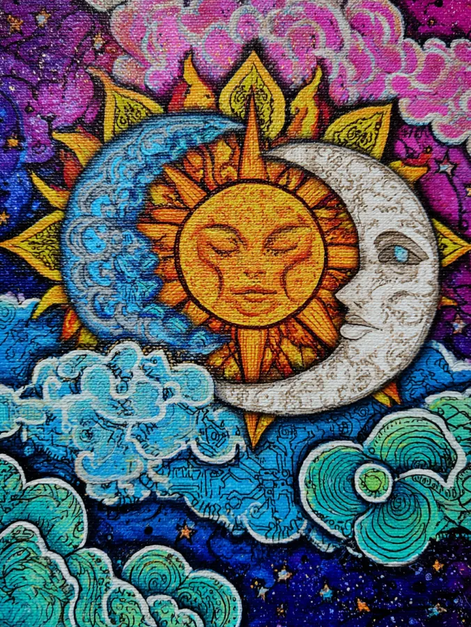 This mini canvas painting shows a bold celestial scene where the sun and moon meet in a magical sky. At the center, a golden sun with a calm expressive face radiates warm shades of orange and yellow. A curved silver moon overlaps the sun, creating a beautiful contrast between light and shadow. Around them swirl layers of colorful clouds in turquoise, teal, and soft blue, while the sky glows with deep indigo, purple, and hints of pink. Decorative stars and patterned details add texture across the scene, and the brush strokes create a rich hand painted look that makes the whole composition feel vibrant and mystical.