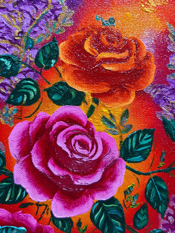 This mini canvas painting is filled with lush blooming roses that almost glow against a vibrant background. Large petals in deep pink, coral red, and warm orange swirl outward with soft layered brush strokes. Rich green leaves weave between the flowers and add contrast that makes the blooms stand out even more. The background glows with warm sunset shades of orange and golden yellow with hints of lavender and delicate botanical patterns scattered throughout. The thick textured paint gives the petals a velvety look that makes the roses feel lively and full.