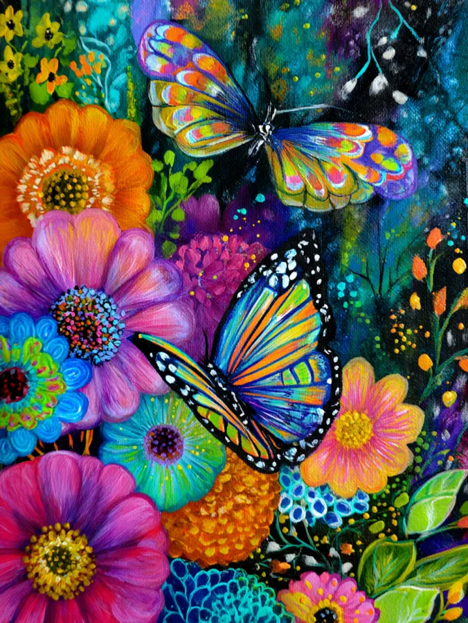 This mini canvas painting is bursting with life and color. Two bright butterflies float above a garden packed with blooming flowers in pink, coral, yellow, turquoise, and violet. Their wings shimmer with rainbow tones and delicate patterns that stand out against the darker leafy background. The flowers fill the entire canvas with layered petals and playful textures while tiny dots of light add sparkle around the scene. Thick brush strokes and bold outlines give the petals and wings a lively handmade look that makes the whole garden feel energetic and joyful.
