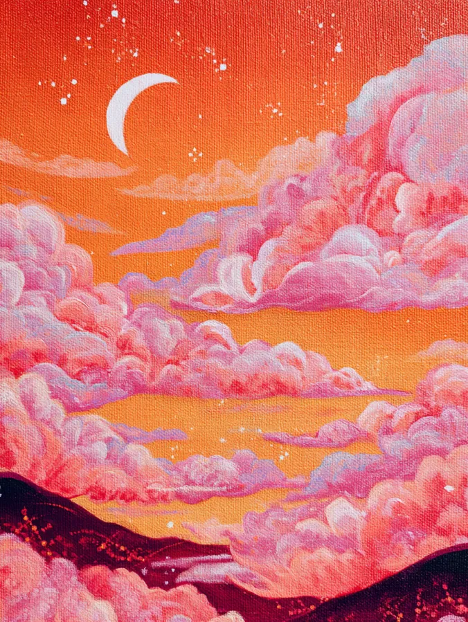 This mini canvas painting features a glowing sunset sky filled with fluffy pink clouds drifting across a warm orange backdrop. Soft layers of cotton candy clouds swirl across the scene in shades of blush, coral, and pale lavender. A delicate crescent moon floats quietly in the upper sky while tiny white stars sparkle around it. Dark rolling hills sit along the horizon which adds contrast and depth to the bright sky. Gentle blended brush strokes give the clouds a soft airy texture that makes the entire scene feel dreamy and light.