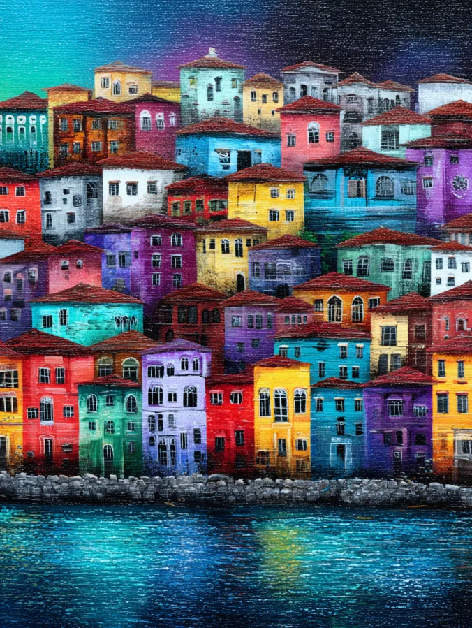 This mini canvas painting shows a lively seaside village stacked along the shoreline. Rows of charming little houses fill the scene, each painted in bright shades of turquoise, yellow, coral, lavender, and deep blue. Their warm red rooftops create a beautiful repeating pattern across the hillside. The buildings sit closely together which makes the composition feel full and vibrant. Below the village, calm water reflects hints of the colorful homes while the sky fades into deep twilight shades. The textured brush strokes bring life to the tiny windows, rooftops, and walls, giving the whole painting a cheerful storybook charm.