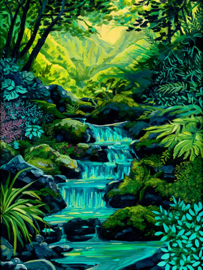 This mini canvas painting captures a peaceful jungle scene filled with glowing shades of green. A small waterfall flows gently down a series of mossy rocks and pools before winding into a calm stream at the bottom of the canvas. The surrounding forest feels thick and alive with layers of leafy plants, tall trees, and tropical foliage framing the water. Bright lime greens and golden sunlight glow in the distance while deeper emerald and teal tones create cool shadows in the foreground. The brush strokes are bold and textured, giving the rocks, leaves, and water a rich painted look that makes the whole scene feel vibrant and full of life.