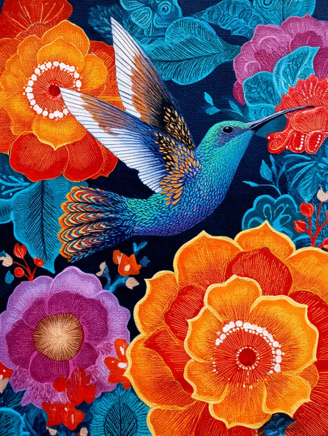 This mini canvas painting bursts with color and detail. A shimmering hummingbird glides gracefully across the center with wings spread wide. Its feathers glow in shades of turquoise, teal, and hints of violet with tiny strokes that add beautiful texture. Surrounding the bird are oversized blooming flowers in bold orange, coral, pink, and golden yellow. Deep blue leaves and layered botanical shapes fill the background which makes the bright petals and delicate wings stand out even more. Fine painted lines give the petals and feathers a rich handcrafted look that feels lively and decorative.