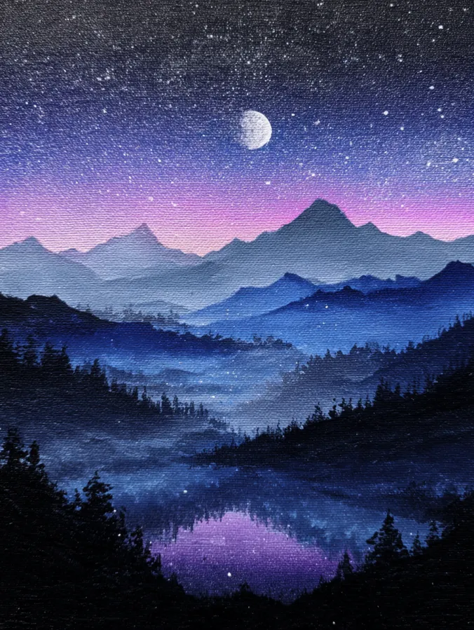 This mini canvas painting shows a peaceful mountain landscape under a glowing night sky. Layered mountain silhouettes fade softly into the distance in shades of deep navy, misty blue, and soft violet. A bright moon hangs above the peaks while tiny stars scatter across the sky. The horizon glows with a gentle blend of lavender and pink that slowly fades into darker night tones. At the bottom of the scene, a calm lake reflects the moon and the surrounding mountains, creating a beautiful mirror effect that pulls the whole composition together. Soft brush strokes build the misty layers and give the scene a dreamy, tranquil feeling.