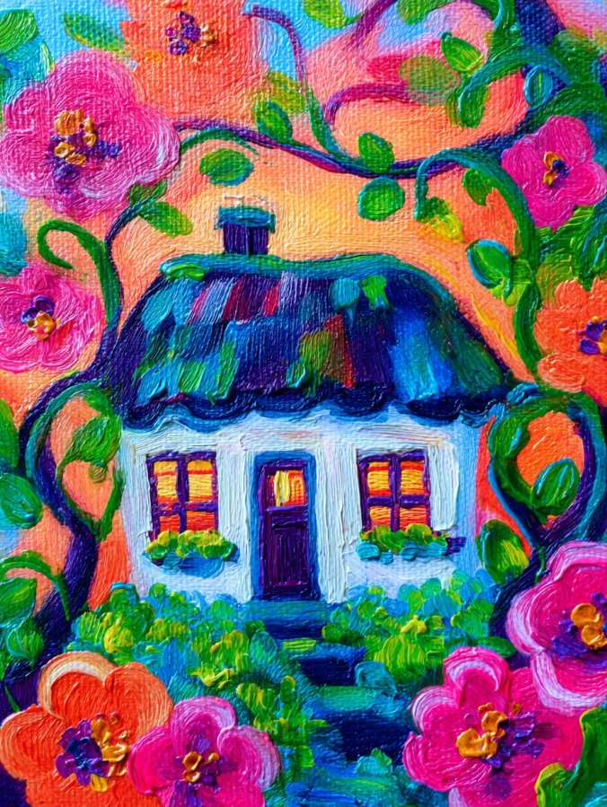 This mini canvas painting feels like a cheerful little storybook scene. A cozy white cottage sits right in the center with glowing warm windows and a charming dark blue roof brushed with lively strokes of teal and purple. Curving green vines wrap around the house and burst into oversized flowers in bright pink, coral, and peach. The background glows with warm sunset shades of orange and soft pink that make the colorful blooms stand out beautifully. Thick textured brush strokes give the petals, leaves, and roof a playful handmade look that makes the whole painting feel vibrant and joyful.