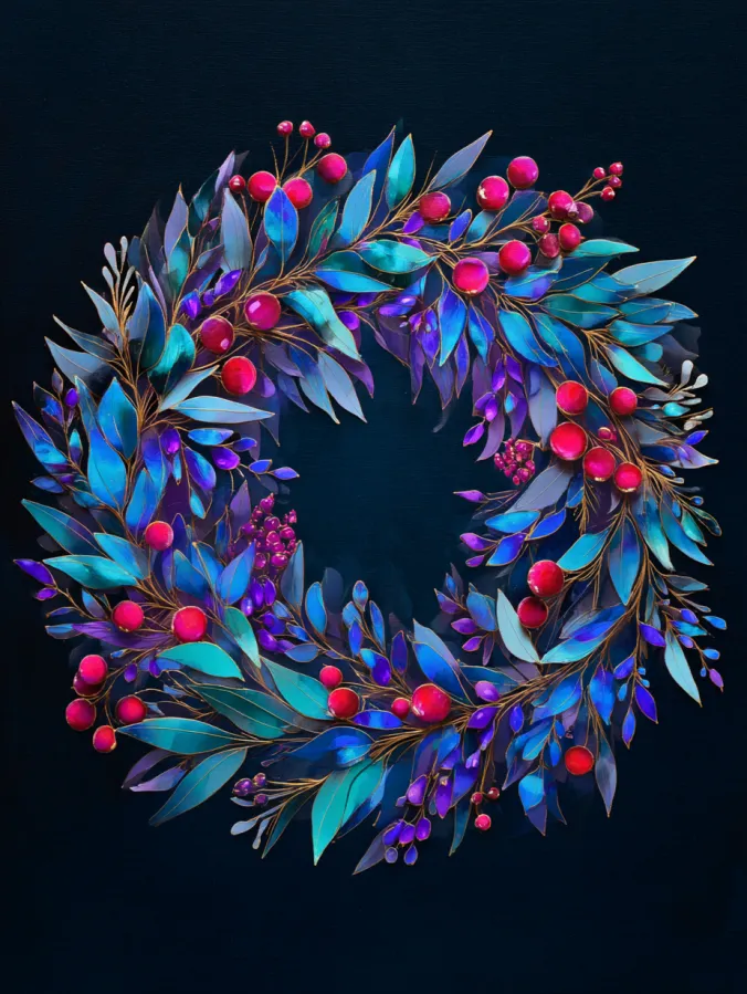 This mini canvas painting features a beautifully arranged botanical wreath set against a deep midnight blue background. Delicate branches curve in a perfect circle, covered with layered leaves painted in shimmering shades of teal, turquoise, and soft indigo. Bright berry clusters in rich pink and crimson add playful pops of color throughout the wreath. Fine golden stems weave between the leaves and berries, giving the composition a graceful and decorative feel. The brush strokes are smooth yet textured, and the glossy highlights on the berries make them look almost jewel like against the dark backdrop.
