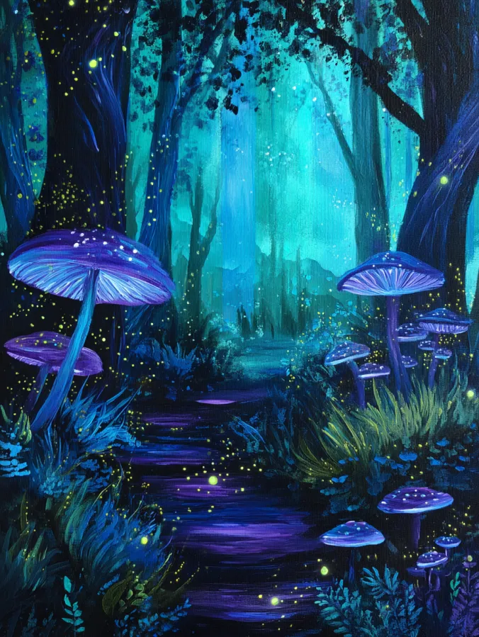 This mini canvas painting feels like a tiny doorway into a magical forest. Tall shadowy trees stretch upward while soft teal light glows through the misty woods in the distance. A winding path leads through the center of the scene, guiding the eye deeper into the forest. Along the edges of the trail, oversized mushrooms glow in shades of lavender, violet, and soft blue. Tiny golden specks of light float through the air like fireflies, adding a dreamy sparkle to the scene. The brush strokes blend deep blues, greens, and purples to create layers of depth, while the glowing highlights give the forest a mysterious nighttime glow.