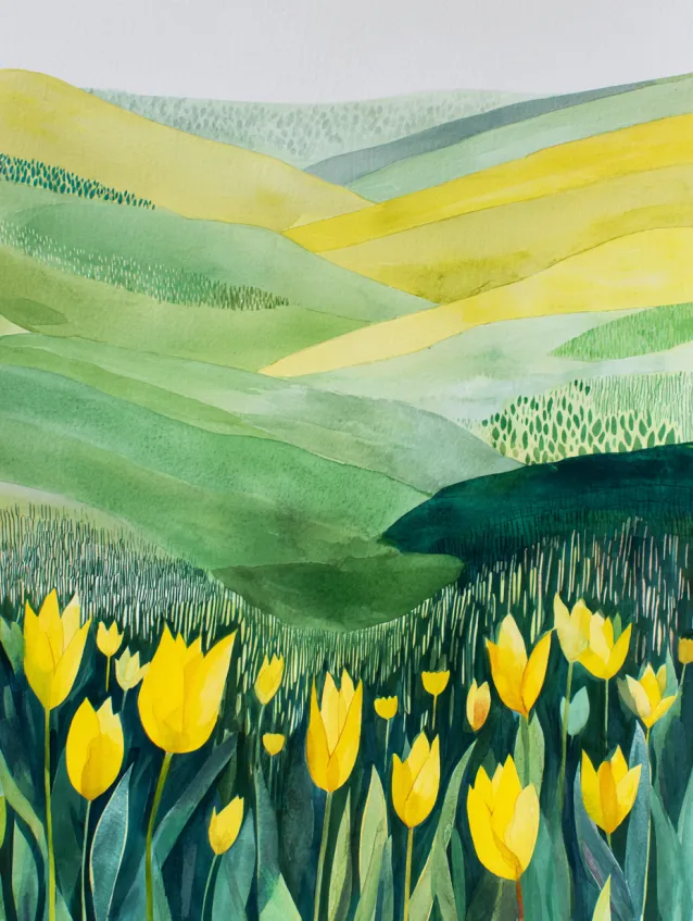 This watercolor shows a cheerful field of bright yellow tulips stretching across soft rolling hills in fresh spring greens. The foreground is filled with loose, upright blooms while the background fades into layered hills washed in light lime and buttery tones. The brush strokes feel airy and relaxed, with gentle blending in the sky and subtle texture in the grassy layers. Everything feels open and breezy, like a quiet countryside morning.