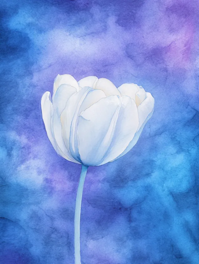 A single white tulip stands centered against a rich blue and violet watercolor wash. The petals are softly shaded with cool tones that give them dimension while still feeling delicate. The background blends seamlessly, creating a glowing halo effect around the bloom.