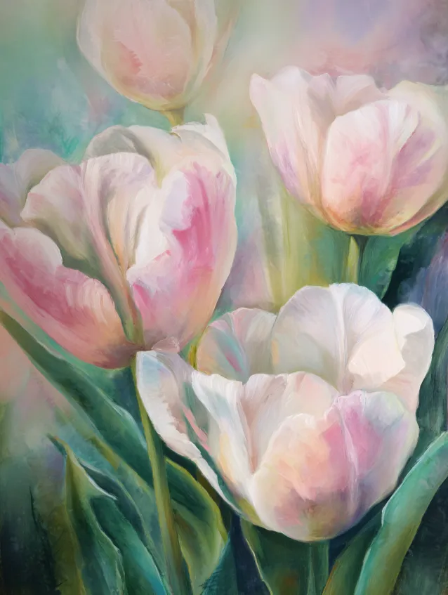 Here we have a gentle cluster of blush and peach tulips painted up close with soft overlapping petals. The greens are muted and mossy, blending into a dreamy abstract background of pale mint and creamy tones. The brushwork feels fluid and organic, with natural bleeds that give the petals a delicate glow.
