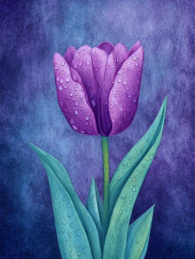 This watercolor features a single violet tulip standing tall against a deep indigo and plum background. Tiny dewdrops sparkle across the petals, painted with delicate highlights that make them look luminous. The leaves are a soft cool green with gentle shading, and the background blends smoothly from dark to light, creating a glowing halo around the bloom. The brush strokes feel controlled yet soft, with beautiful gradients and subtle texture throughout.