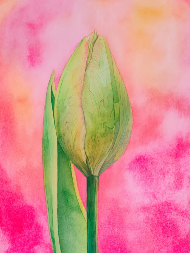 This painting keeps things sweet and simple with a single green tulip bud set against a bright pink and coral wash. The petals are still closed, with soft yellow and peach tones peeking through the green outer layers. The background is dreamy and slightly mottled, allowing the bud to stand out while still feeling cohesive and airy.