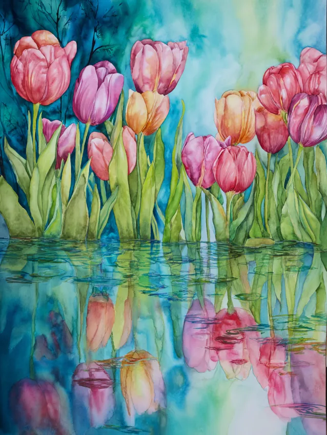 I find reflections so satisfying to paint because they look impressive but are surprisingly simple once you break them down. Repeating the flower shapes in softer, blurrier strokes feels calming and rhythmic. It is the kind of painting that lets me slow down and enjoy watching the colors flow together naturally.