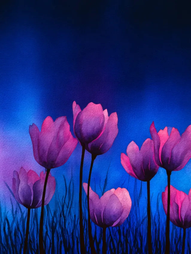 This painting is all about contrast. Rich indigo and electric blue melt together in the background while tall magenta and violet tulips rise from dark grassy silhouettes. The petals glow softly against the dramatic sky, with smooth blends that give them a velvety look. The stems are long and elegant, slightly swaying, which adds movement without crowding the composition.