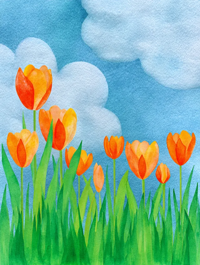 I think this one is so fun because you get to experiment with bold color transitions in the sky. Blending those deep blues feels almost meditative. The tulips themselves are simple enough to keep it relaxing, but the dramatic background makes the final result look way more advanced than it actually is.
