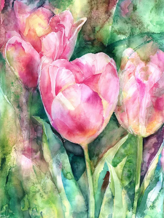 This piece leans into texture with soft pink tulips nestled among layered green foliage. The background has that slightly mottled watercolor effect where colors bloom into each other. Petals overlap gently and catch subtle highlights that make them feel luminous.
