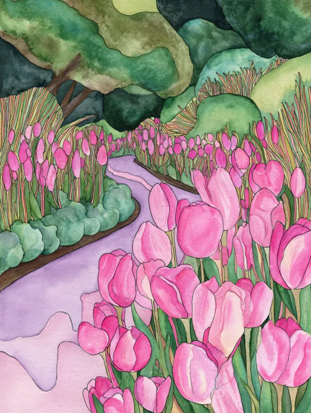 This painting draws your eye down a soft winding path surrounded by rows of pink tulips. The background trees are painted in rounded, layered shapes, creating a cozy enclosed garden feel. The perspective adds depth while the tulips remain sweet and slightly stylized.